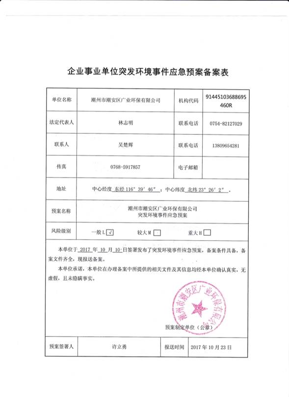 潮州市潮安區(qū)廣業(yè)環(huán)保有限公司根據(jù)自身實際情況制定了突發(fā)環(huán)境事件應急預案,并成立了環(huán)境污染突發(fā)事件應急處理領(lǐng)導小組,根據(jù)制定的應急預案定期開展應急演習,以確保做到對突發(fā)環(huán)境事件反應快速,救援及時,應對措施得力有效,保障社會穩(wěn)定、人民生命財產(chǎn)和生態(tài)環(huán)境安全,保證企業(yè)安全生產(chǎn)和經(jīng)濟效益的提高。